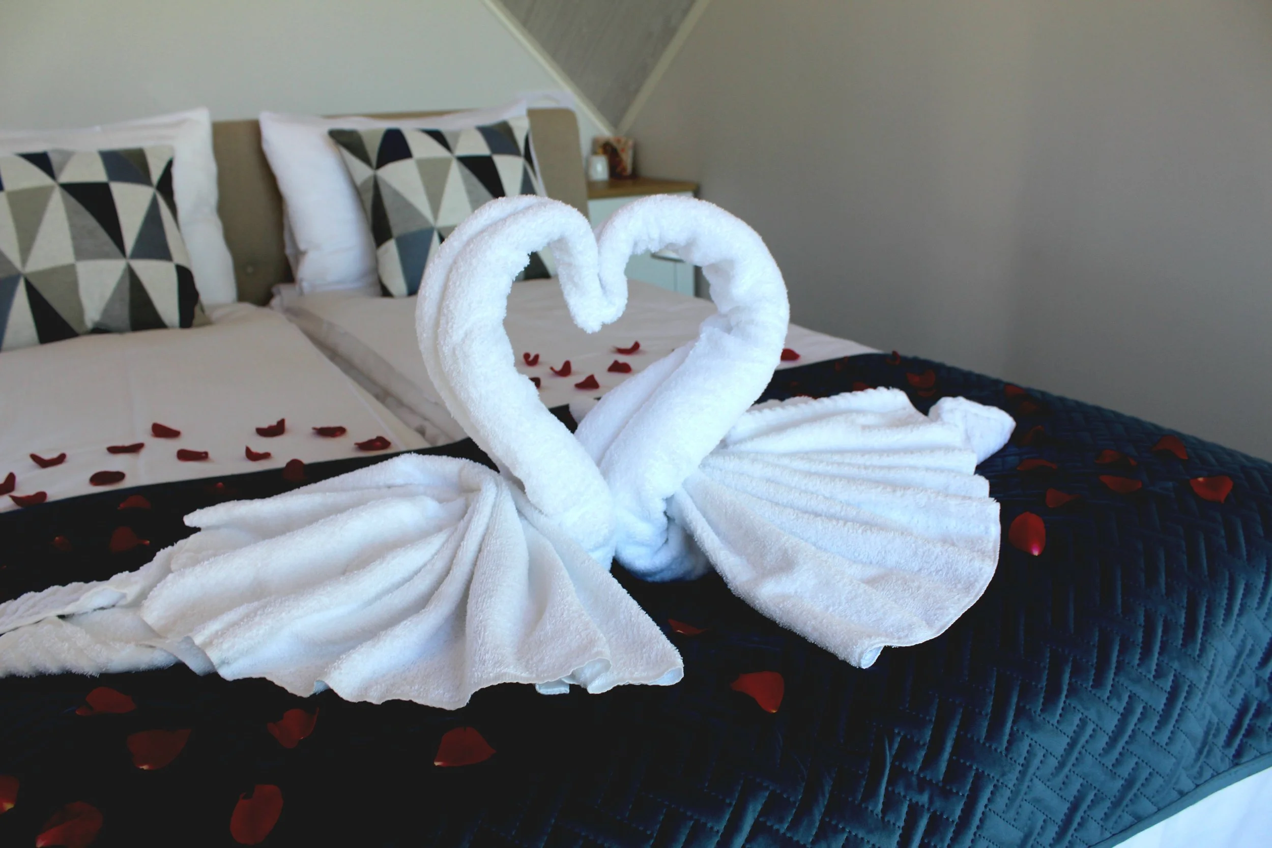 Special decoration of the bed with towel swans and rose petals
